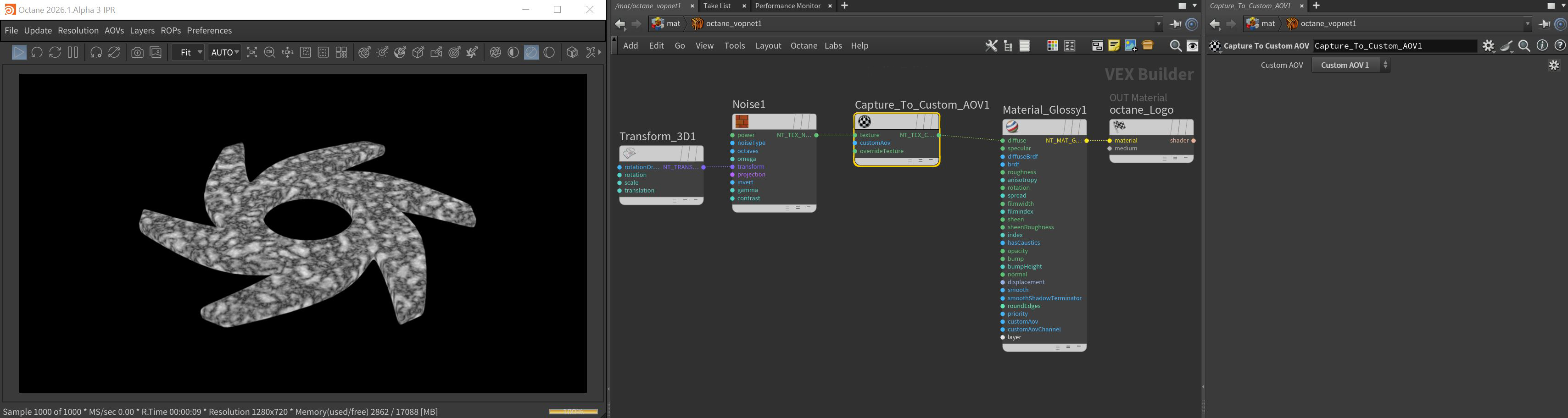 The Capture to Custom AOV node can be used to apply a texture to a custom AOV pass (figure 1). Once a Capture to Custom AOV node has been connected to a material network, the custom AOV needs to be activated in the AOVs tab for the Octane Render Target. See the section on AOVs for more information on using the Octane AOV passes.