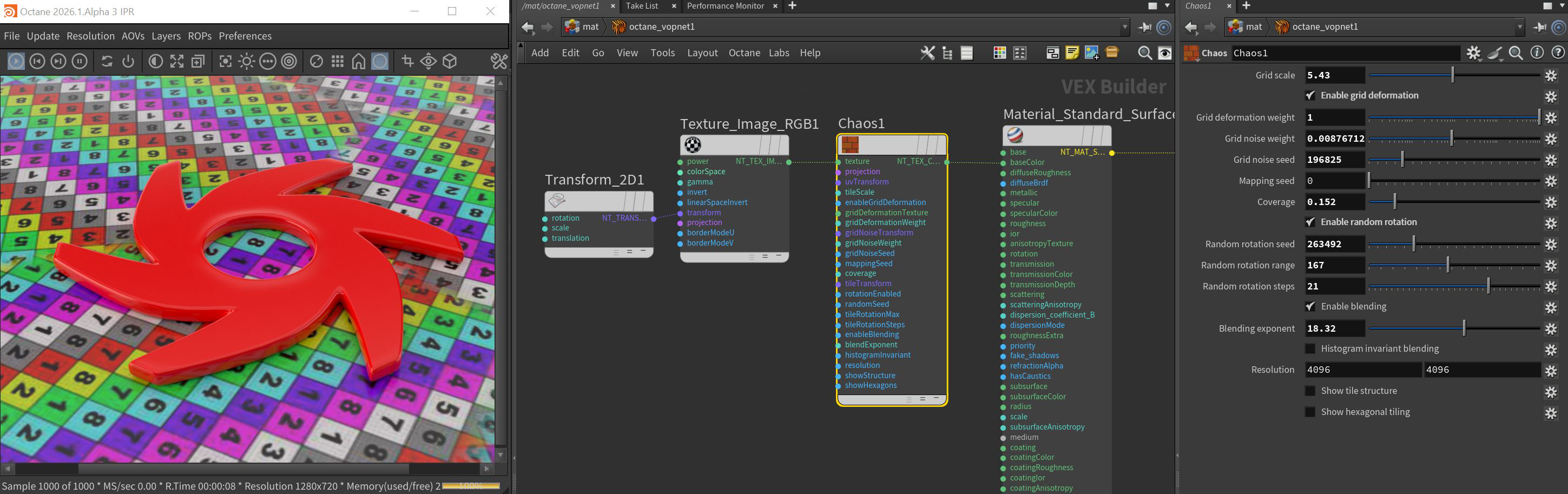 The Chaos texture node randomly scatters an input texture over a surface or UV space (figure 1). This node can be used to hide seams of image textures not intended for seamless use.