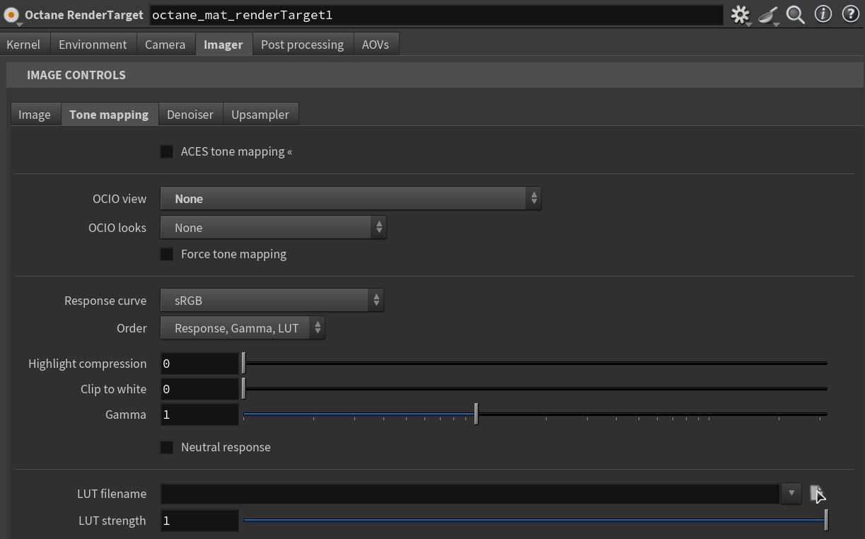 Octane is a spectral render engine. This means that colors within the render are not subject to a specific color space or RGB color but instead are treated using physically accurate wavelength. The wavelengths are only after the fact converted to RGB color spaces.OctaneRender® has its own color settings, display gamma, tone mapping, and color correction for input textures and output renderings. OctaneRender supports OpenColorIO (OCIO) for color management. All color mangement and tonemapping adjustments can be found in the Octane RenderTarget node under the Imager tab (Figure 1). Details on the tone mapping settings can be found in the Imager topic.