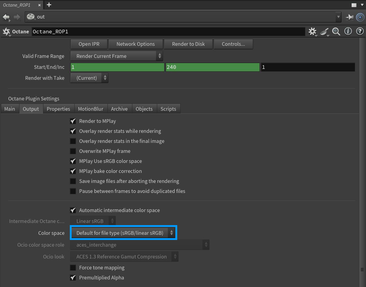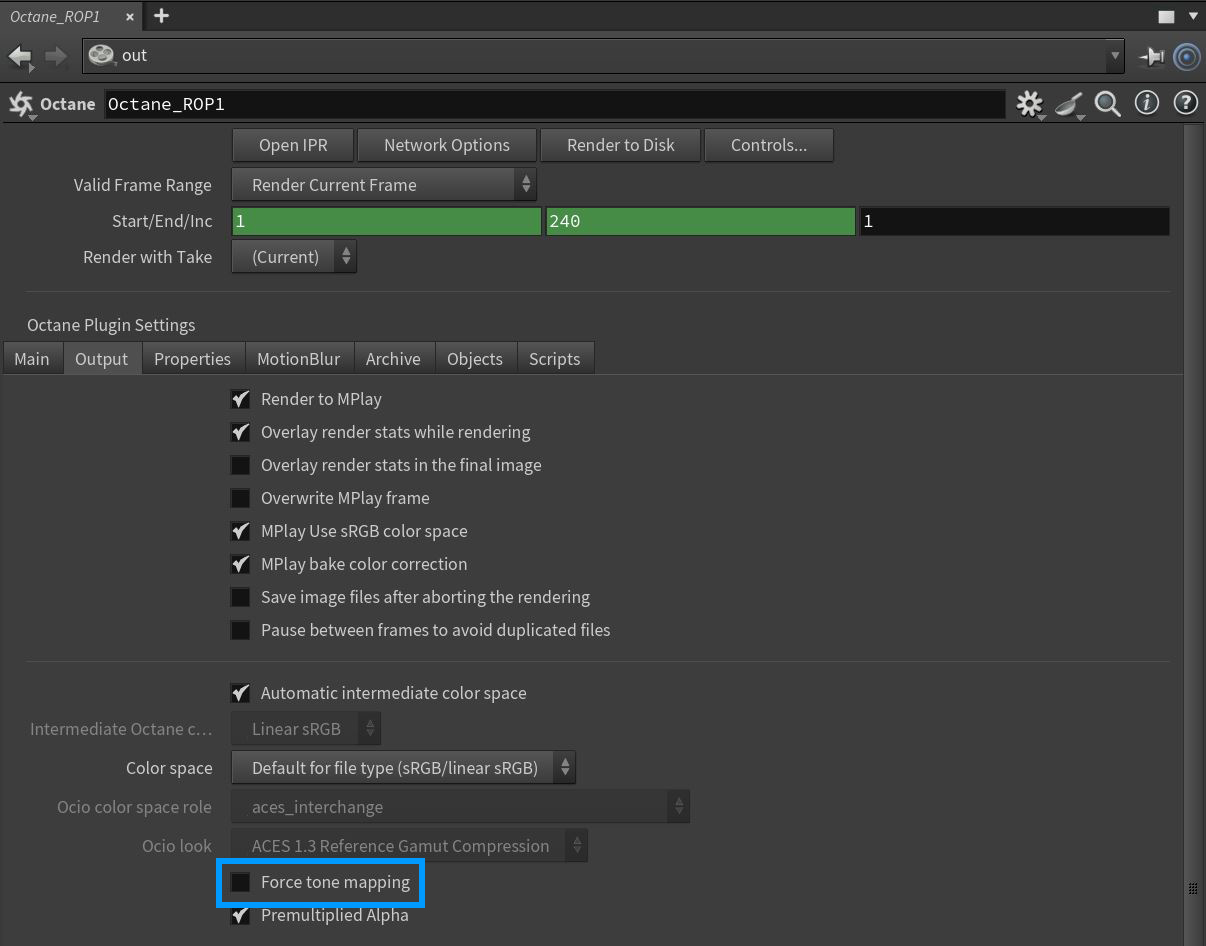 The ocio view/looks parameters are dependent on the OCIO version set in the ocio.json (set to ACES1.3 by default in Houdini 20.5/21) in the houdini documents packages folder (documents/houdini21.0/packages) or the houdini.env. By default tonemapping only affects the IPR image. The color space of the file output is defined in the ROP settings (figure 2). If you want your final image to match your IPR when rendering to EXR you will have to apply the same OCIO transform in your compositing software.Only if rendering to a format like png or when using Force Tone Mapping in the ROP settings will the tone mapping applied to your output image (figure 3).