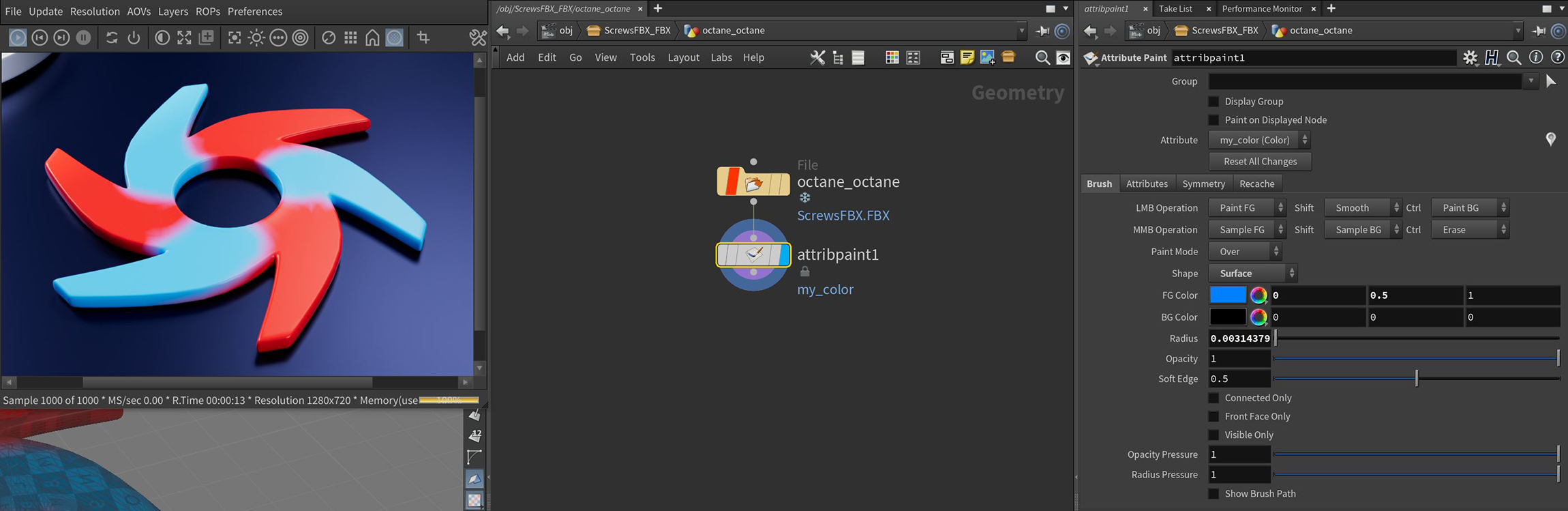 The Color Vertex Attribute texture works in conjunction with the Houdini® Attribute Paint node (Figure 1). This texture node displays vertex paint data on native OctaneRender® materials.