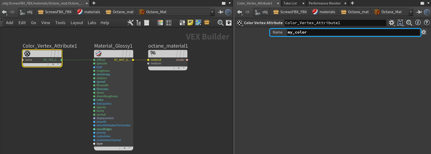 Figure 2: The Name attribute for a Color Vertex Attribute node that is connected to the Diffuse input on an Octane material
