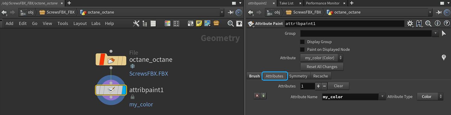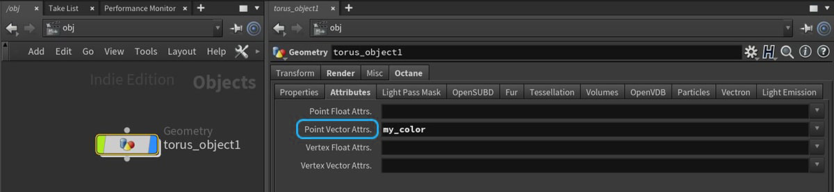 One additional step is required in order to render the Attribute Paint data on an object in the scene. The Object Spare Parameters need to be added to the scene object (Figure 4) and the attribute name from the Attribute Paint node needs to be added to the Point Vector Attrs. parameter in the Attributes tab (Figure 5).