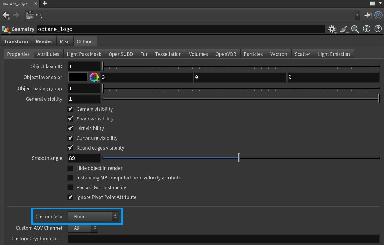 Custom AOVs are a container that can be used to capture certain aspects of a scene via different methods. An option as been added to the Octane Obj Params tab to write masks into custom AOVs (figure 1). Additionally, it can be specified to write the mask into specific channels (all / red / green / blue). Custom AOVs have an option to allow you to specify whether you can write to the AOV only on the first bounce (for camera rays) or also after (specular) reflections and/or refractions. This way you can capture those attributes also in reflections and/or through transparent material. There can be up to 20 Custom AOVs in a scene (figure 2). However, the custom AOV masks can be contained in a single channel (R, G, or B). This allows for a total of 60 custom AOVs to be used in any given scene.