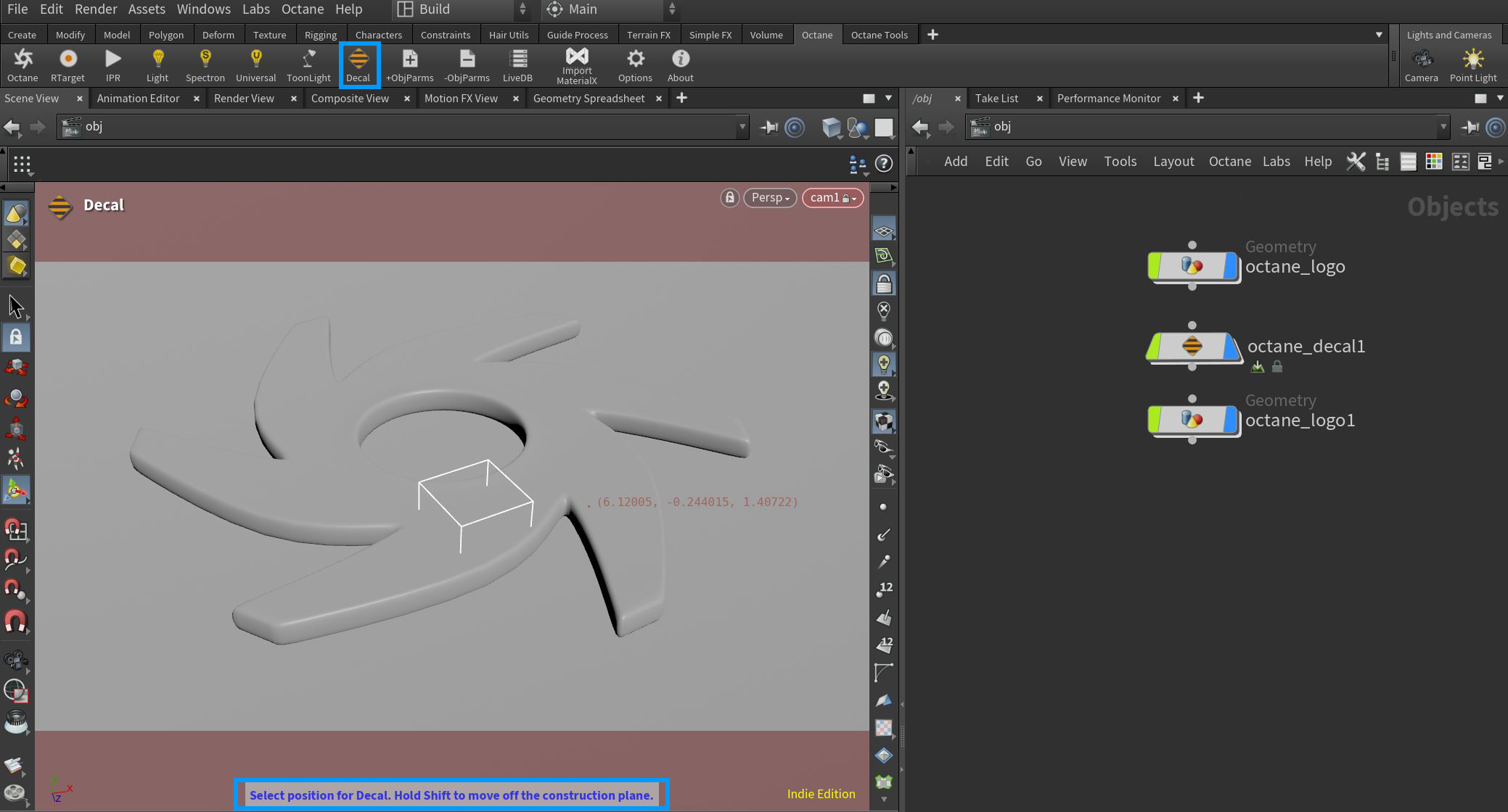 The Octane Decal node can be access from the Octane shelf. Once the Octane Decal node shelf icon is pressed, you will be instructed to select position for the decal. This will create a bounding box where the decal will be displayed.(figure 3). The position of the decal can be further manipulated with the HoudiniĀ® Move, Rotate, and Scale tools.