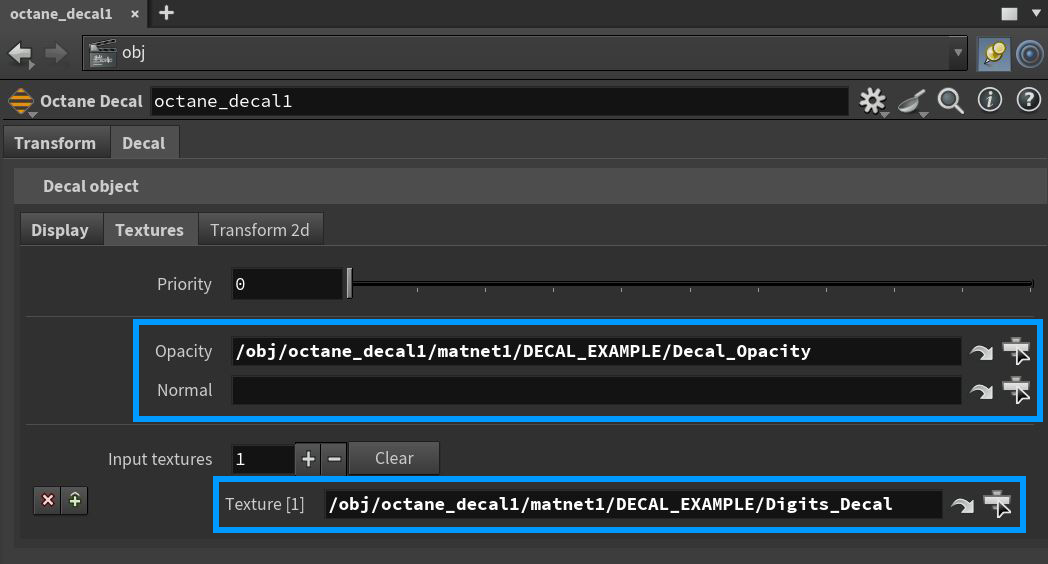 The texture maps to be used as decals are specified in the Octane Decal node's Decal > Textures parameter tab (figure 5). There is a default set of decal texture maps specified for Opacity, Normal, and Input Texture but these parameters can be mapped to texture maps located in any Octane VOPNET.