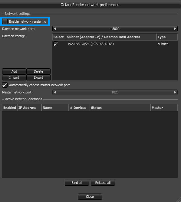 Select the Enable Network Rendering checkbox in the OctaneRender Network Preferences window (Figure 2). The Primary Node opens a socket at the specified Master Network Port and listens at that port for render nodes trying to connect to the primary node. It starts scanning the specified subnet in the local network for daemons and as soon as a render node with the correct version connects, the Script window shows a message about the additional GPUs and render nodes. Additionally, the Network Options dialog includes an option to turn automatic port configuration for the Primary Render Node on or off. If enabled, you can use multiple primary render nodes on the same computer.
