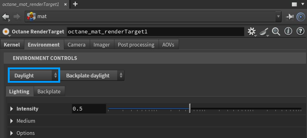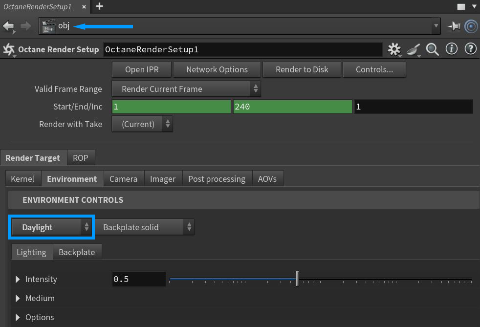 The Daylight system is found in the Environment tab of the Render Target parameters window (Figure 2). The Daylight system can also be found in the Octane Render Setup node located in the Object window (figure 3).