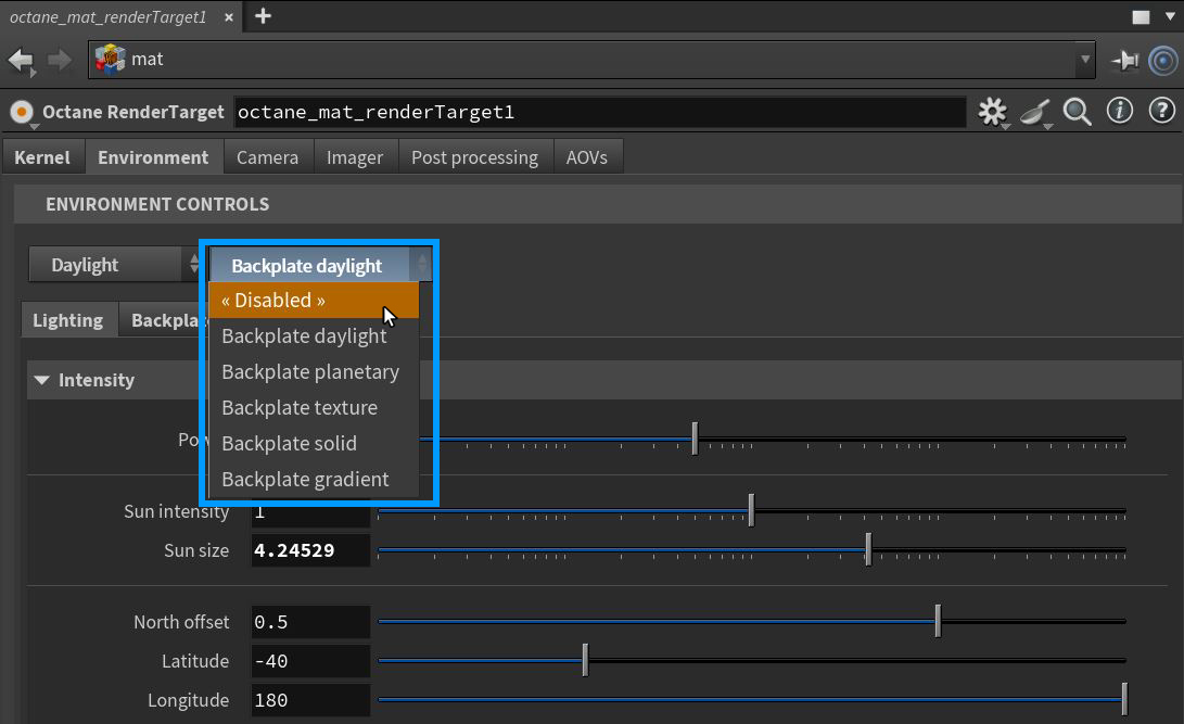 NOTE The Backplate parameters do not affect the physical lighting on scene objects. |