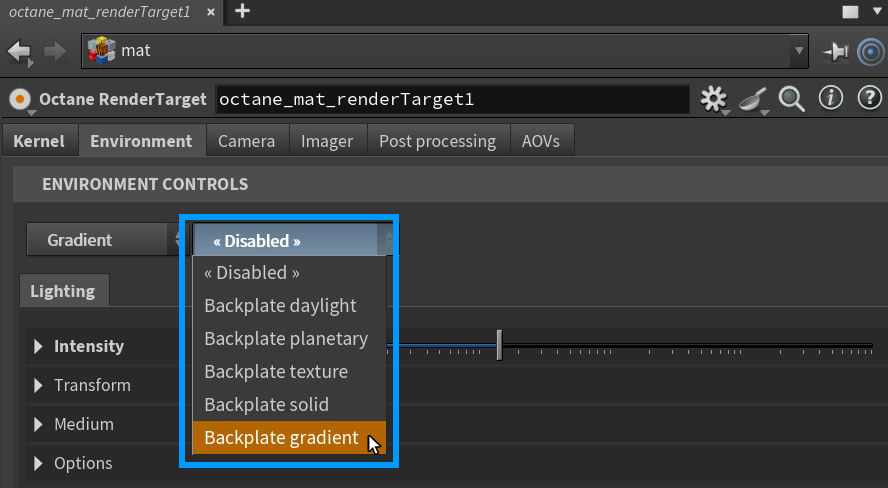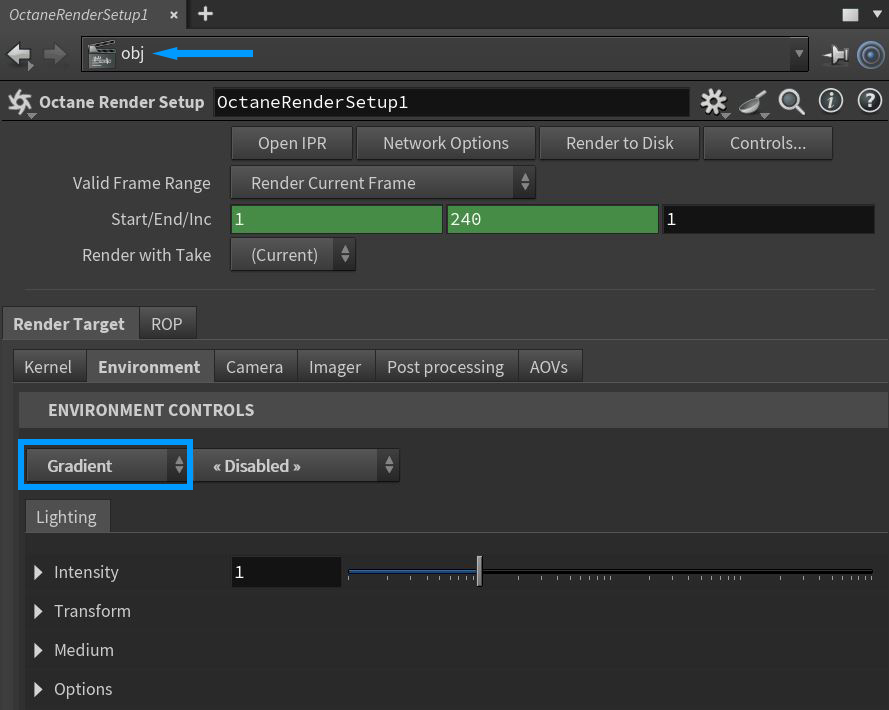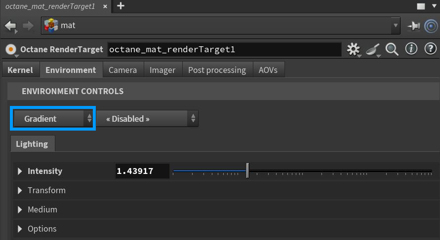 Figure 2: Accessing the Gradient environment node from an Octane Render Target.