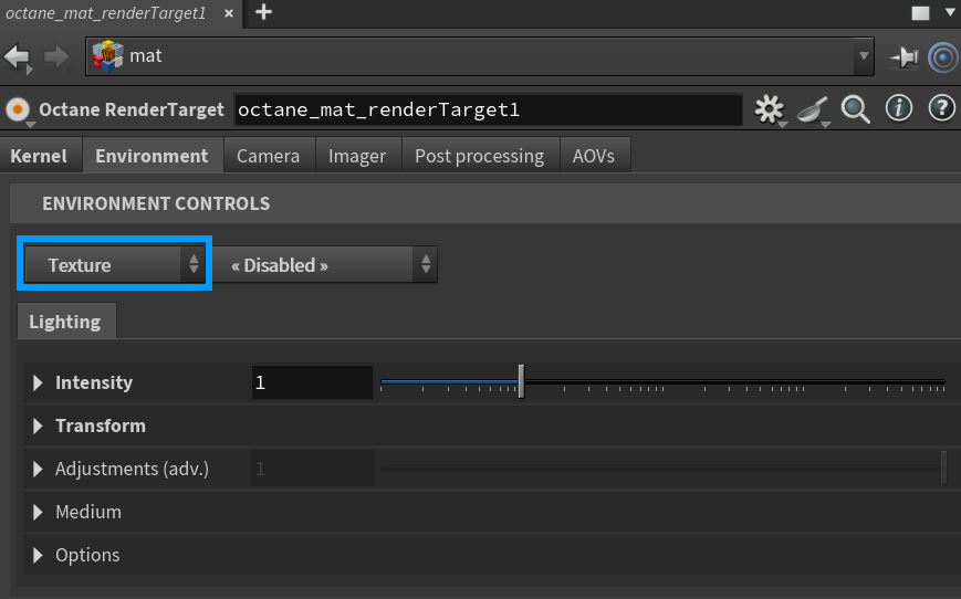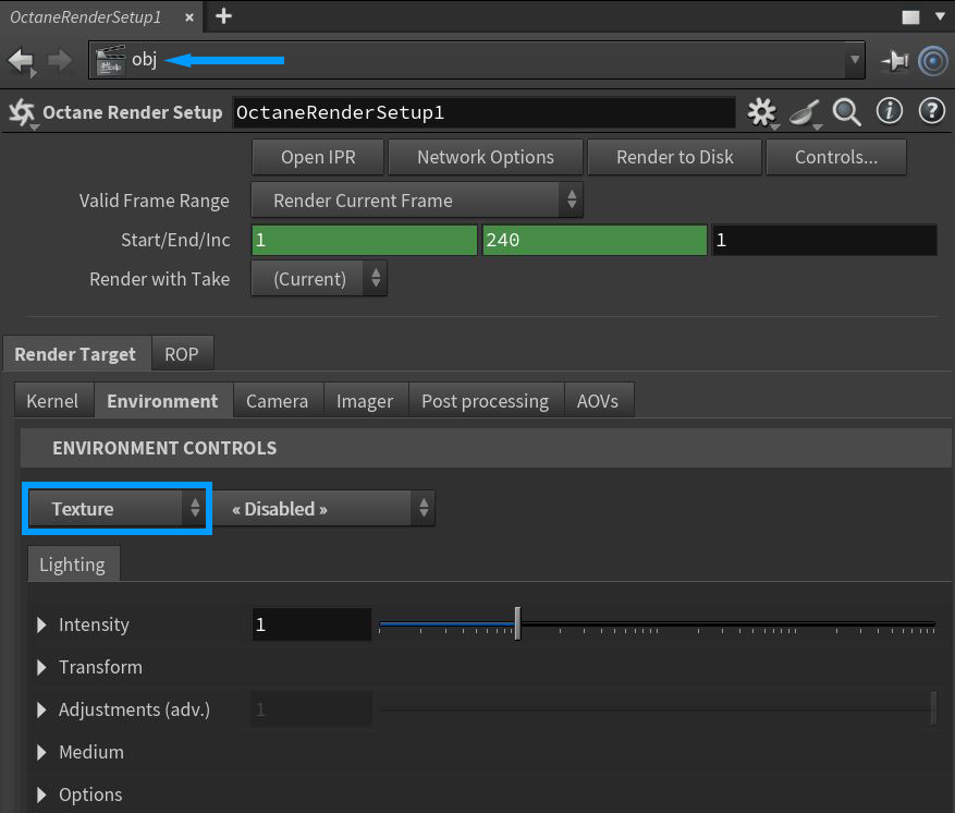 The Texture system is found in the Environment tab of the Render Target parameters window (Figure 2). The Texture system can also be found in the Octane Render Setup node located in the Object window (figure 3).