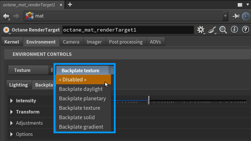 Parameters specific to the Texture system are found in the Intensity, Transform, Adjustments, Medium, and Options rollouts.There is a Backplate tab available to further control the options for displaying backplate elements (figure 4). If the Backplate is set to anything other than Disabled, the Backplate parameters will override any duplicate background elements available in the Texture tab. Note that the Backplate parameters do not affect the physical lighting on scene objects.