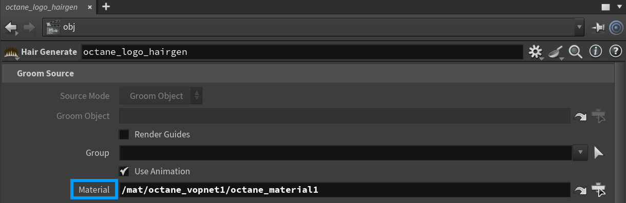 Make sure to add the +ObjParms node to the Hair Generate node and set the Octane Object Type to Fur in the object's Octane tab (figure 7). Create a material for the hair in the MAT network. There is an Octane specific hair material that can be applied to the object. More information on the Octane Hair Material can be found in the Materials Overview section. Select the object's Hairgen node and add the hair material in the Material parameter (Figure 8).