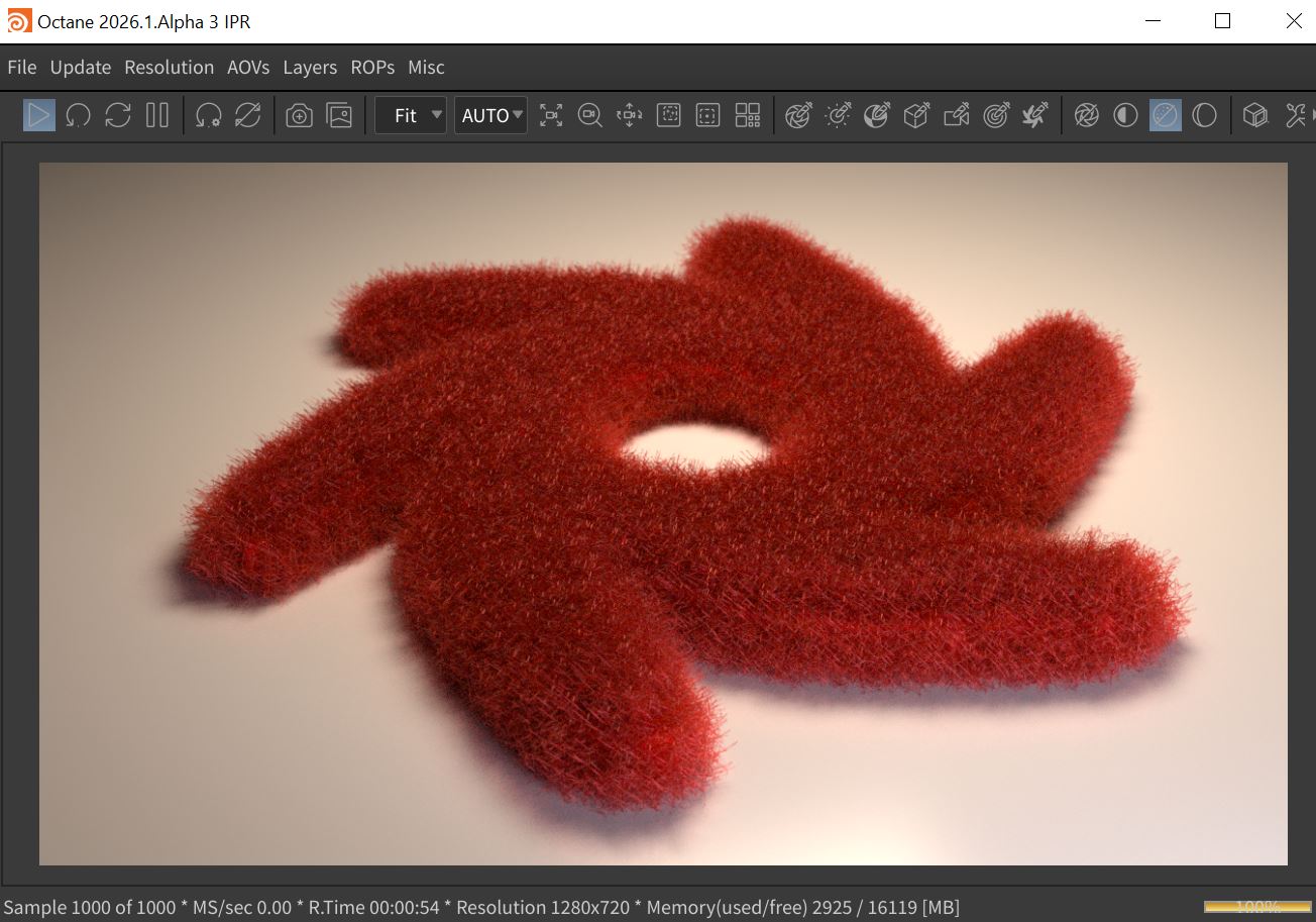 The OctaneRender® for Houdini® plugin can render polygon mesh edges as Octane Hair and Houdini Fur objects. The Octane Fur is rendered with motion blur if the hair object has the Velocity parameter enabled. It also supports UV texture mapping from the UV map available in the Skin root object.