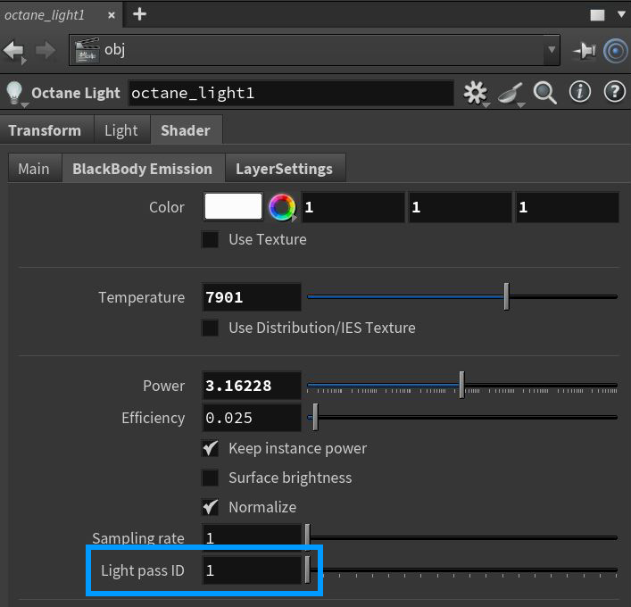 The Light Pass IDs are used to selectively determine which lights contribute to the scene or effect certain objects in a scene.By default all lights and objects are set to Light Pass ID 1. The ID number for a light source can be found in the light source's Blackbody or Texture Emission tab (figure 1).