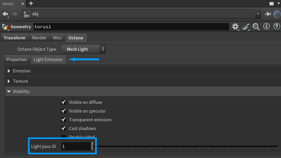 If a scene object is used as a light source, the ID number can be accessed from the Visibility rollout under the Light Emission tab found in the Octane Object Parameters (figure 2).