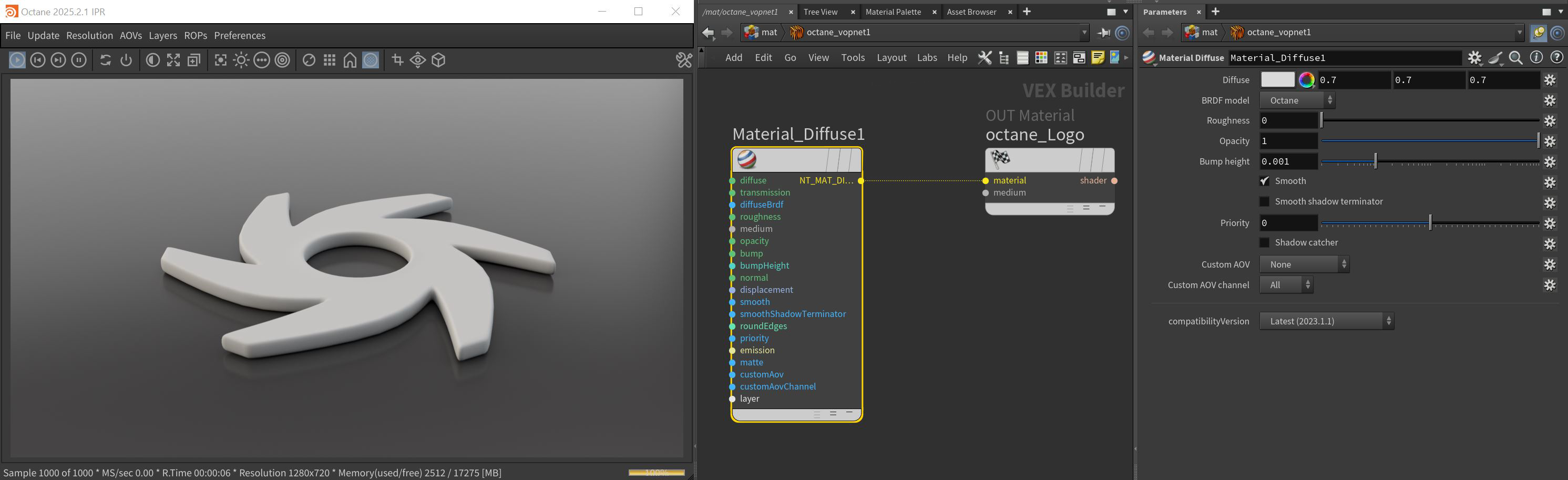 BRDF Model - Provides three models for diffuse light reflectance. Lambertian reflects light equally in all directions and does not support roughness. The Octane option creates a sheen effect much like velvet. And, the Oren-Nayar option behaves more like clay.