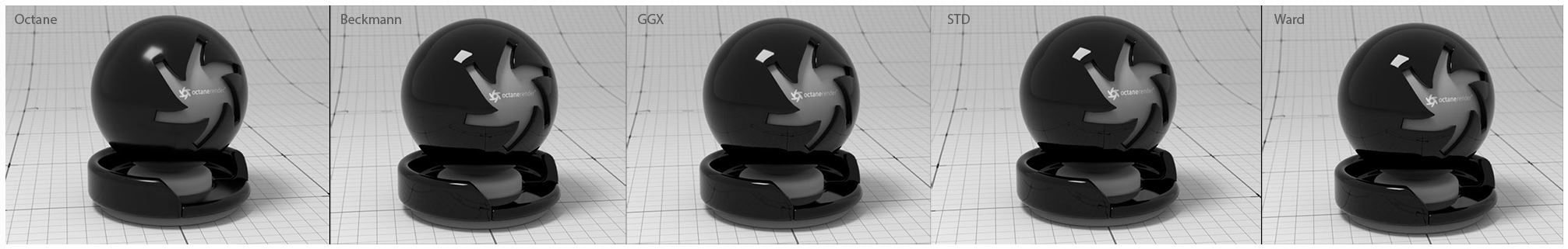 BRDF Model - The BRDF (Bidirectional Reflectance Distribution Function) determines the amount of light that a material reflects when light falls on it. For Glossy materials, you can choose from six BRDF models. Specific geometric properties (the micro-facet distribution) of the surface affects each BRDF, which describes the surface's microscopic shape (i.e. micro-facet normals) and scales the brightness of the BRDF's reflections.