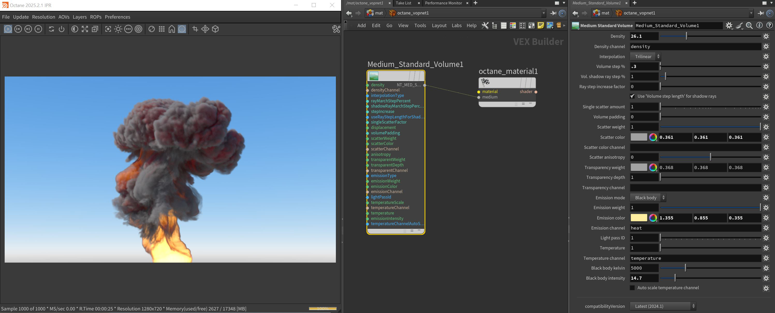The Standard Volume Medium node is a volume medium node with comprehensive controls for adjusting volume, scatter, transparency, emission, and temperature parameters based on VBD grid data. The node's parameters are listed here and details on how to set up volumes are covered in the Effects Overview section.