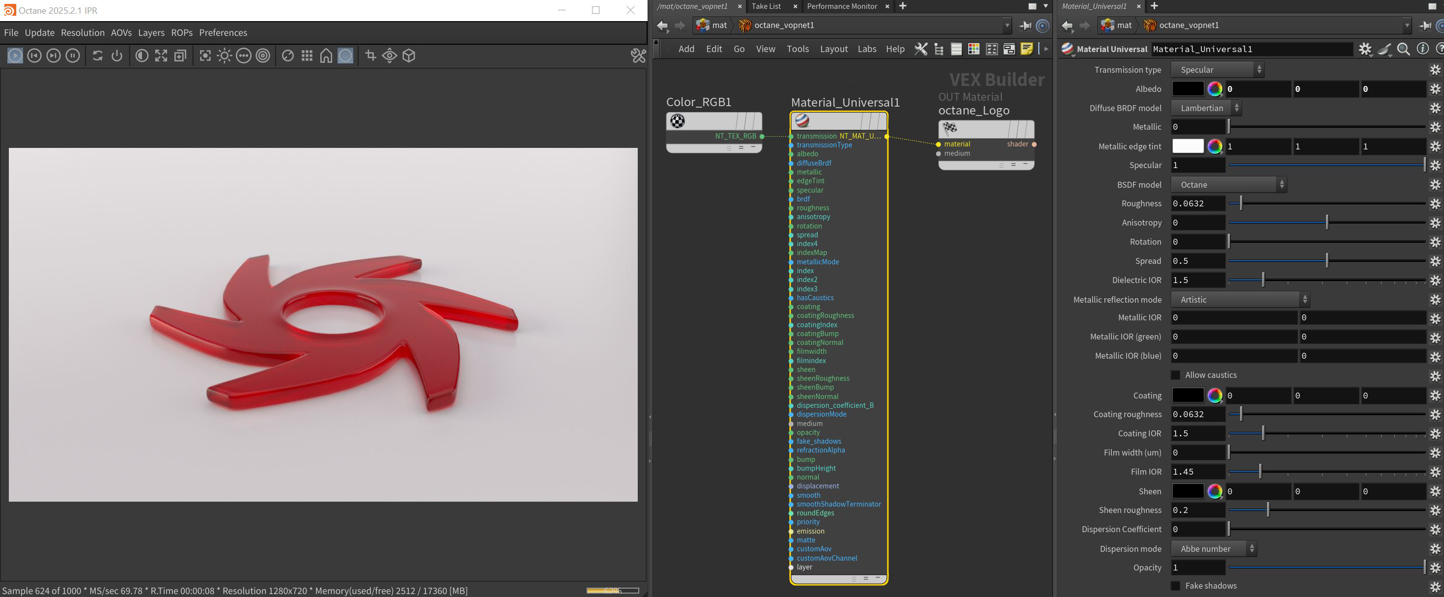 It handles dielectric material (Diffuse and Glossy BRDF) and also metallic materials (Glossy BRDF) with assumed IOR or custom IOR for both dielectric and metallic surfaces. Material IOR in the base layer of the Universal material is also not limited to scalar values, and this can be controlled procedurally with texture-type nodes and OSL shaders connected to IOR texture input pins.