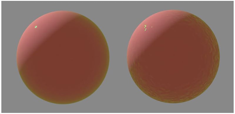 Figure 3: The sphere on the right has an Octane Turbulence texture connected to the Coating Bump attribute