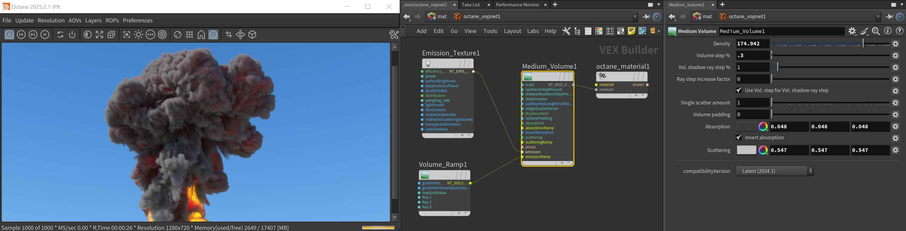 Volumetrics shading is done using the Medium Volume VOP node, linked to the Medium input of a Material (Figure 1). The node's parameters are listed here and details on how to set up volumes are covered in the Effects Overview section.