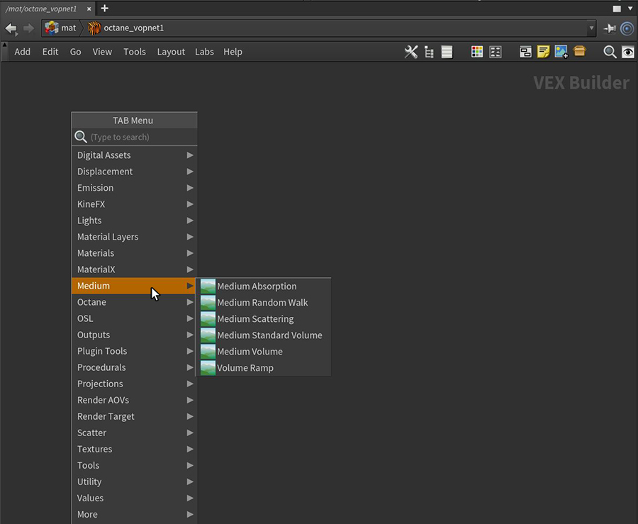 Rendering a medium requires the Path Tracing or PMC kernel, with a large Maxdepth setting. For Diffuse materials, you can use the Direct Light kernel with Diffuse mode set to GI. The medium nodes can be found in the Medium category when right-clicking in an Octane VOP NET (Figure 1).