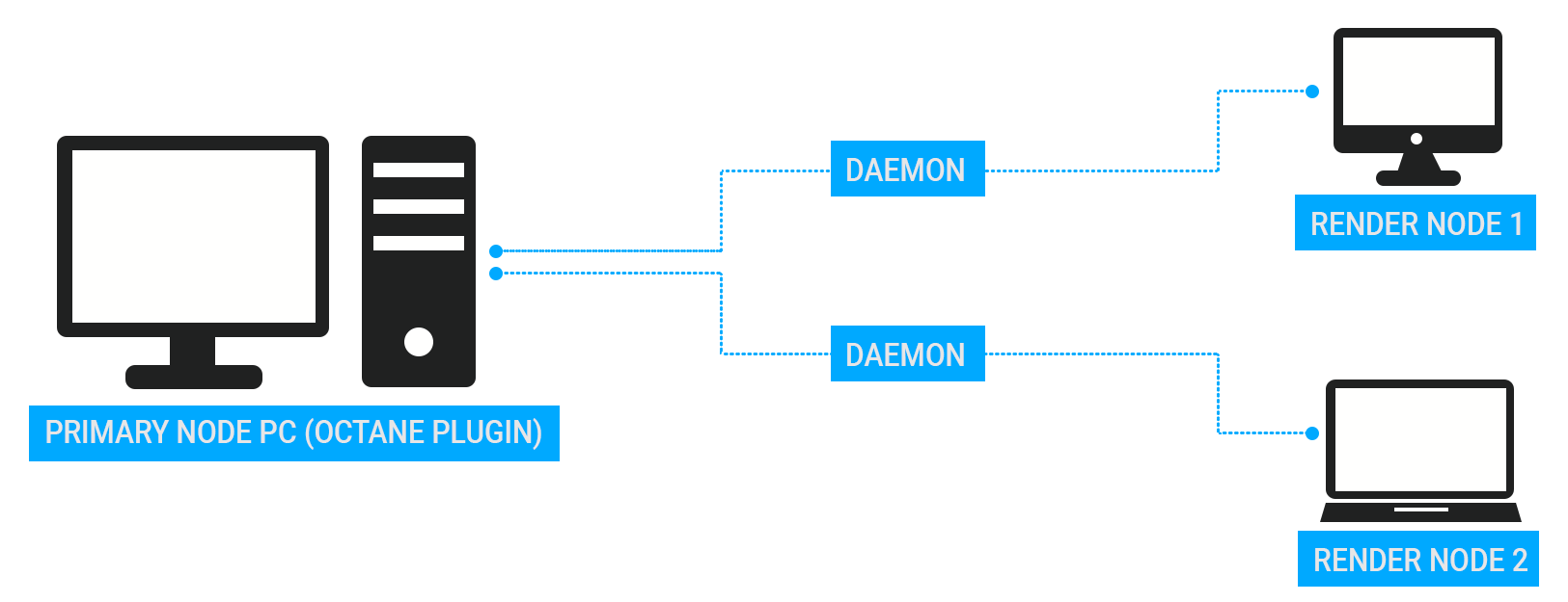 The OctaneRender Primary Node does all the render data processing. The Render Node does not need to have a powerful CPU, but the Render Node needs enough RAM to store the render data plus some render results. The Render Node's operating systems can also be different since the communication between the machines is cross-platform. No data is stored on the Render Node’s discs, it's all stored in memory.