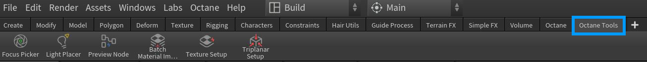 There are two Octane shelves. The main shelf includes all the basic tools to work with the plugin, like adding the Octane ROP node or the RenderTarget MAT node, Octane lights, etc. (Figure 2). The Octane Tools tab provides additional features for scene design (Figure 3).