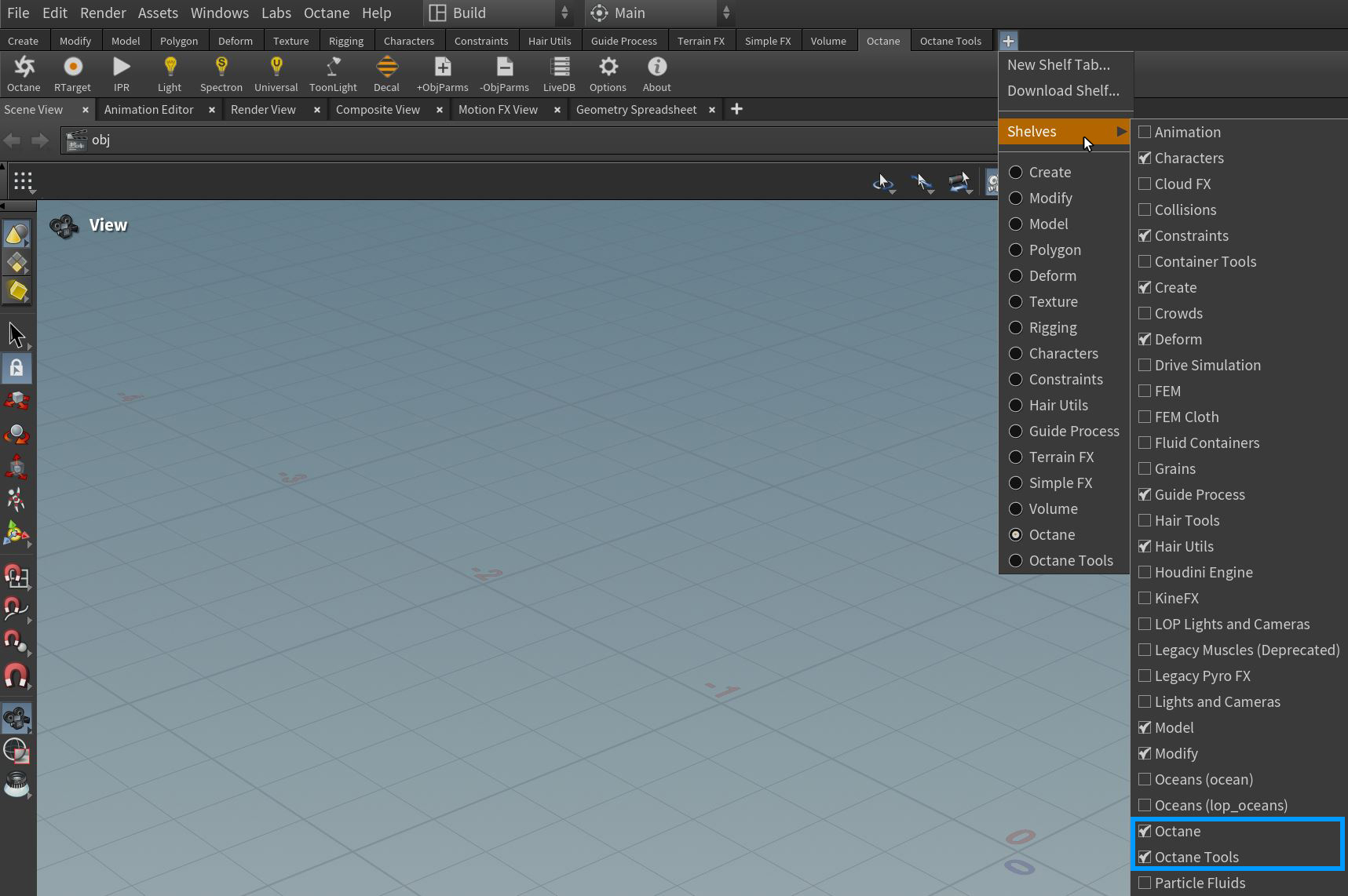To add the Octane shelves, click on the + icon at the end of the shelf tabs, then click Shelves and select Octane (Figure 4).
