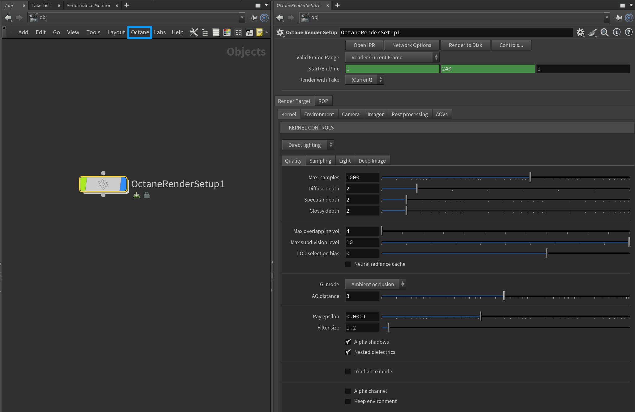The Octane Render Setup node combines both the Octane ROP and Octane Render Target parameters into one node accessible in the OBJ network window (figure 1).