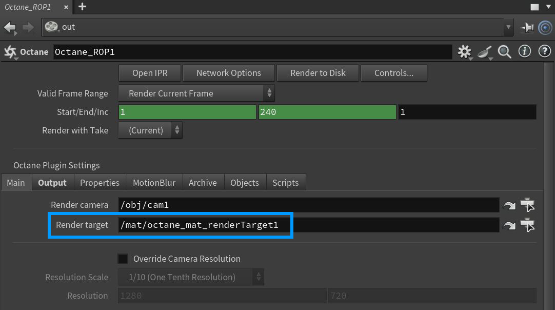 Figure 2: The default location that an Octane ROP uses to reference an Octane Render Target