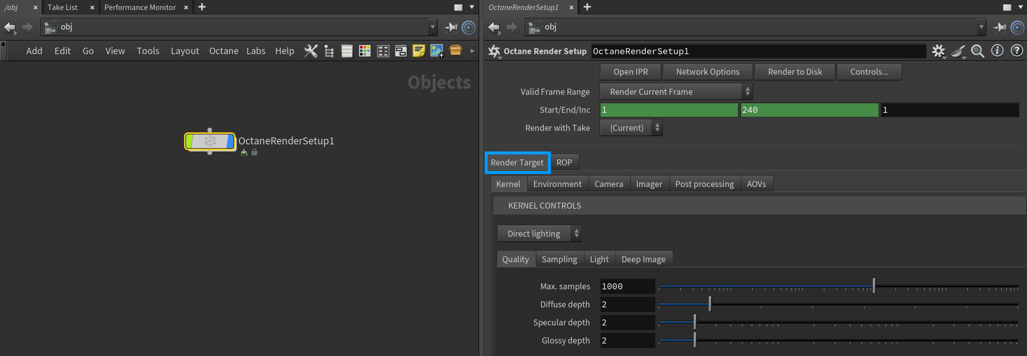 Figure 3: Accessing the Render Target parameters from the Octane Render Setup node
