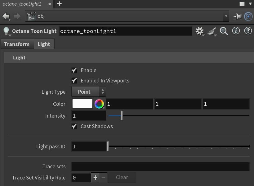 The Toon Light consists of a two parameter tabs. The Transform tab provides access to data related to the position and orientation of the light source. The Light tab provides access to Light Type, Color, Intensity, Light Pass ID, and Trace Sets (Figure 2).