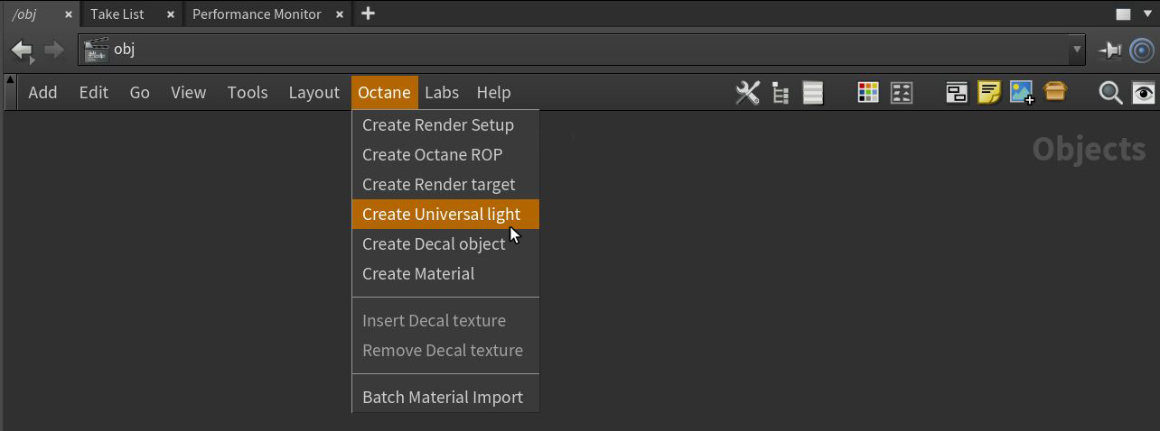 The Octane Universal Light can be added to a scene from the Octane shelf tab (figure 2) or from the Octane menu in the OBJ network view (figure 3).
