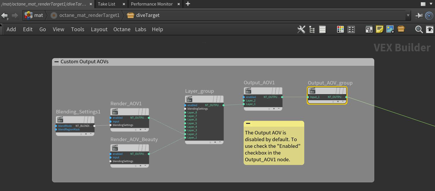 There is an Output AOV default system set up inside the RenderTarget node. After enabling the system in the Output AOV node, Render AOV nodes and Effects nodes can be added to the Layer Group node (figure 2).