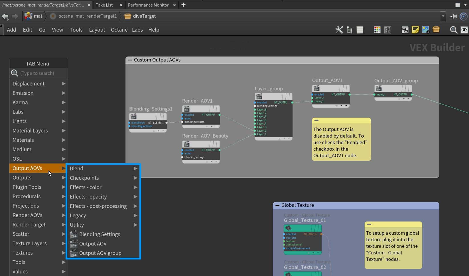 There are numerous categories of Output AOV nodes that can be access by right-clicking in the RenderTarget VEX Builder window (figure3). Details on the usage of these nodes can be found in the Octane Standalone documentation under the Output AOVs section.