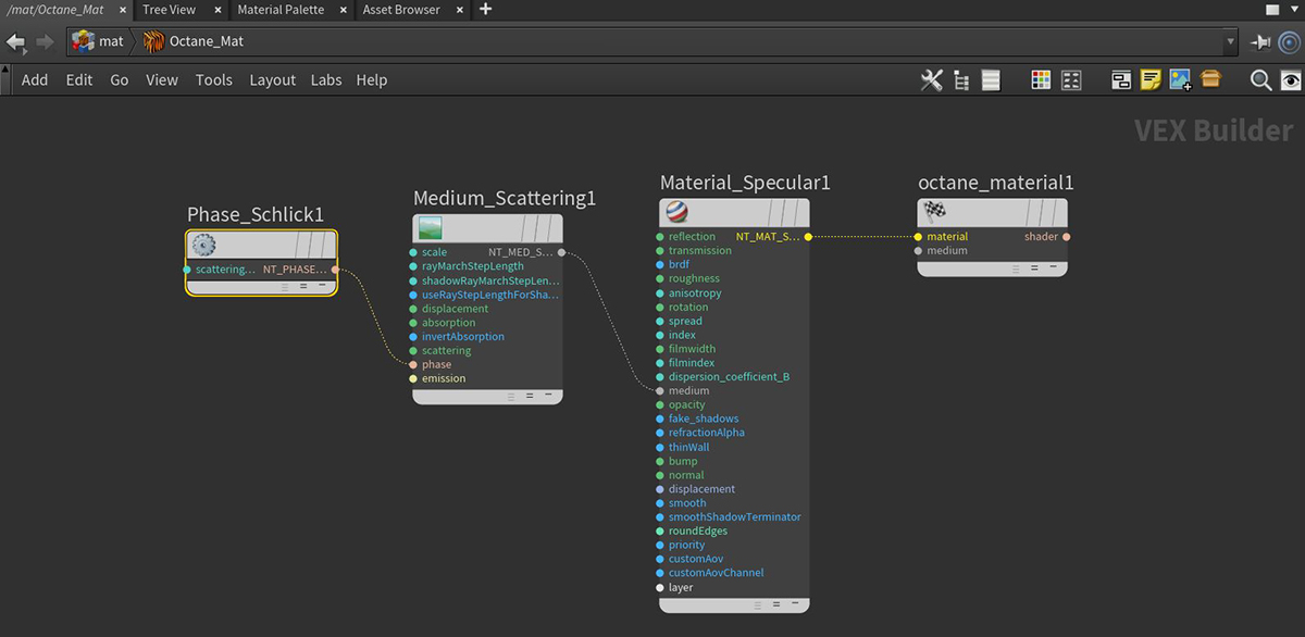 Figure 1: The Phase Schlick node connected to the Scattering node in a material network