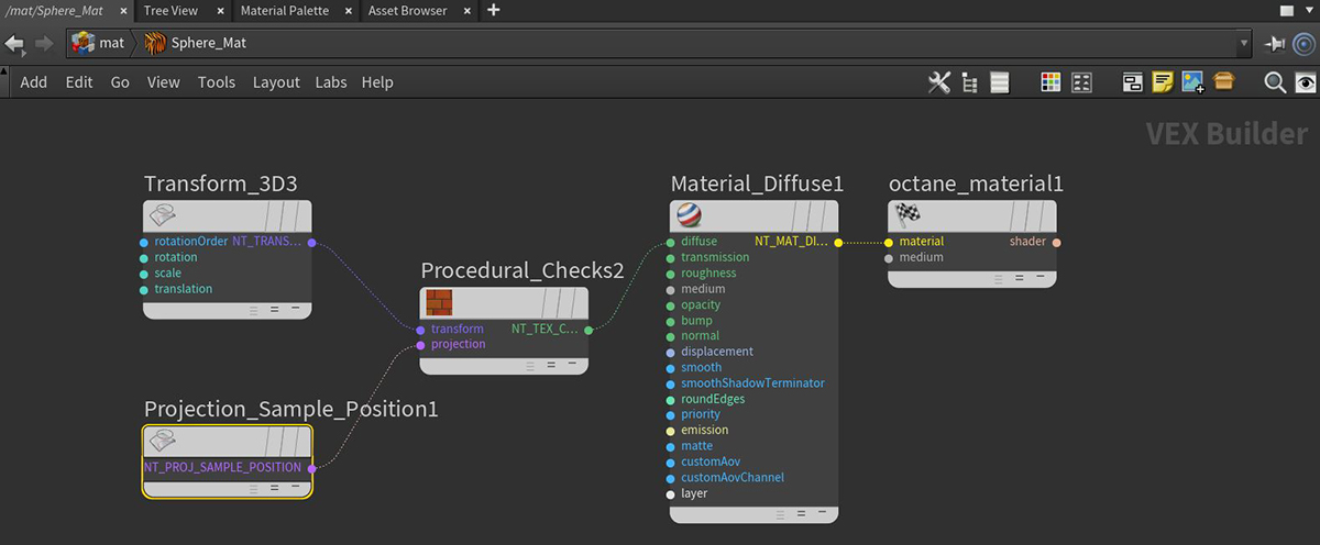 Figure 1: Projecting a Check texture using the Sample Pos. to UV node as the projection type.