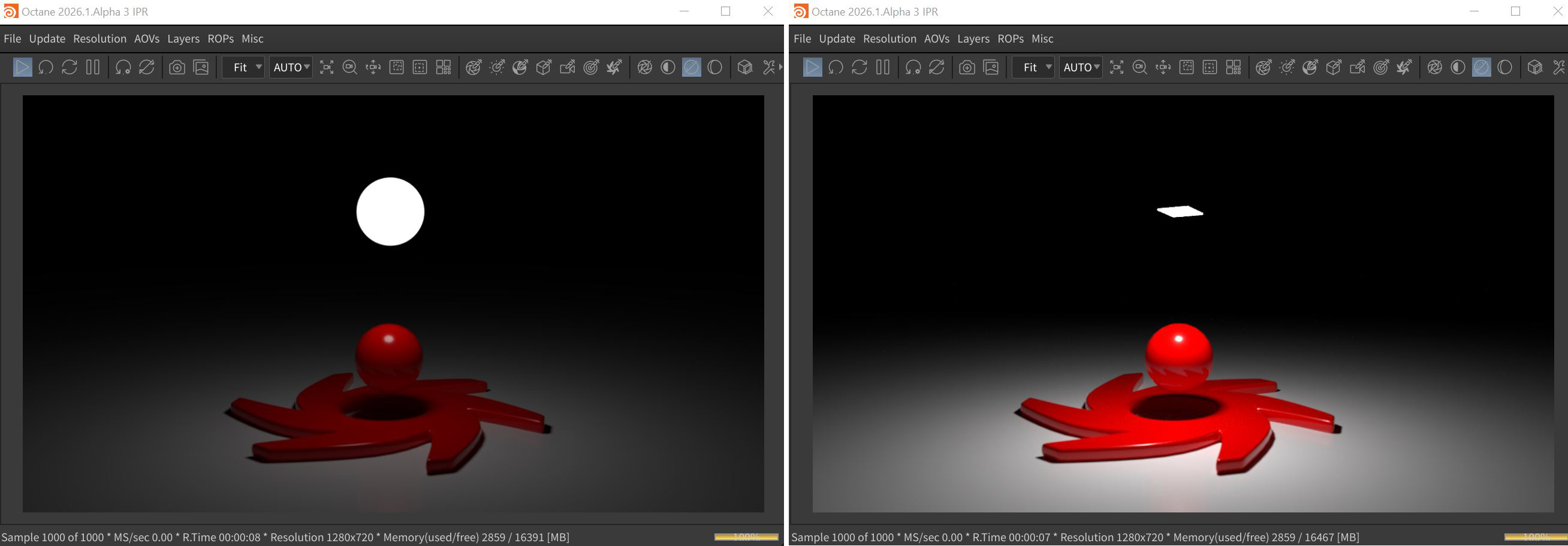 The Quad and Sphere Spectron lights provide a more traditional light shape and surface interaction for the Spectron procedural lighting system (figure 1). Spectron offers an improved the light sampling algorithm for these light primitives. This allows for improvement in noise reduction for direct light sampling and will generally improve convergence of the image at a faster rate versus the usage of traditional mesh light sampling found in the standard Octane light type.