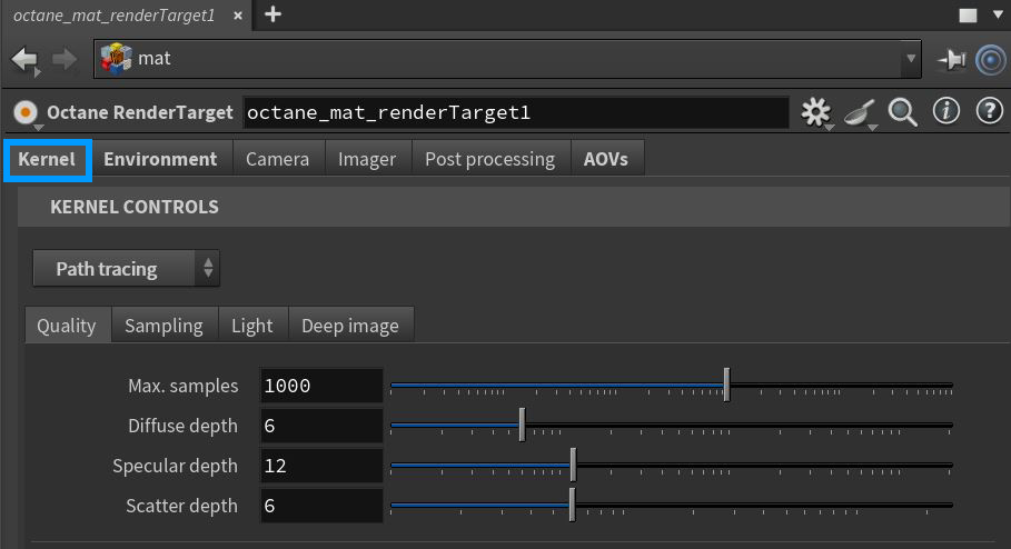 Figure 1: Accessing the Kernel settings in an Octane Render Target node