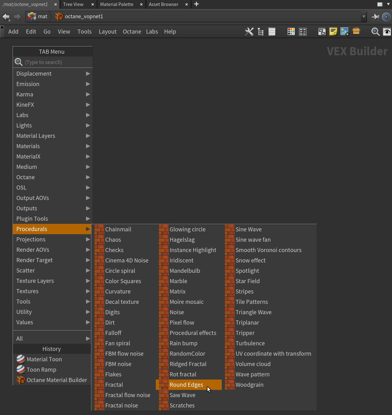The Round Edges node rounds off geometry edges by using a shading effect instead of creating additional geometry. It’s best used for rounded edges that will appear small in the final render. The Round Edges node can be accessed from the Procedurals section in an Octane VOP NET (figure 1).