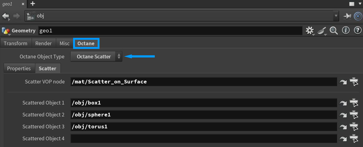 Set the Octane Object Type to Octane Scatter in the Octane tab (figure 3). The Scatter tab is where all the connections are made for the scatter system to function properly. The Scatter VOP Node parameter should point to the Scatter on Surface node in the MAT network. The Scattered Object 1-4 parameter should point towards the objects to be scattered.