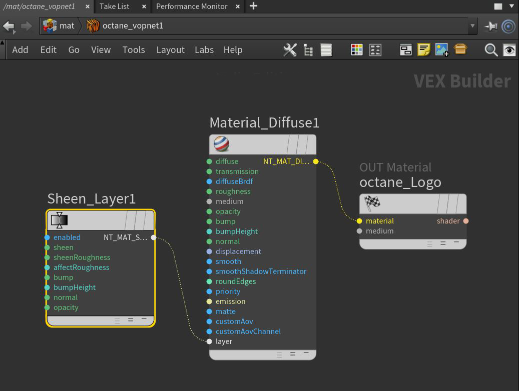 Figure 1: A Sheen Layer mode connected to the Layer pin on a Diffuse Material node