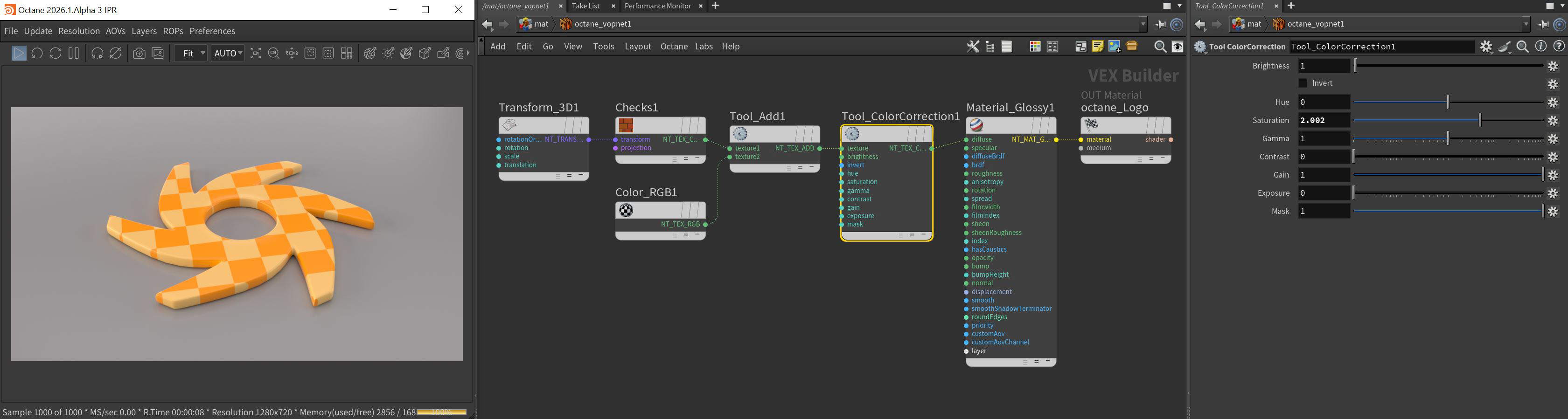 The Color Correction node adjusts incoming texture nodes with traditional color-correction tools such as Brightness, Hue, Saturation, Gamma, and Contrast. In Figure 1, the Color Correction node adds more saturation to the Checks node, which blends with an RGB Color node while using the Add node.