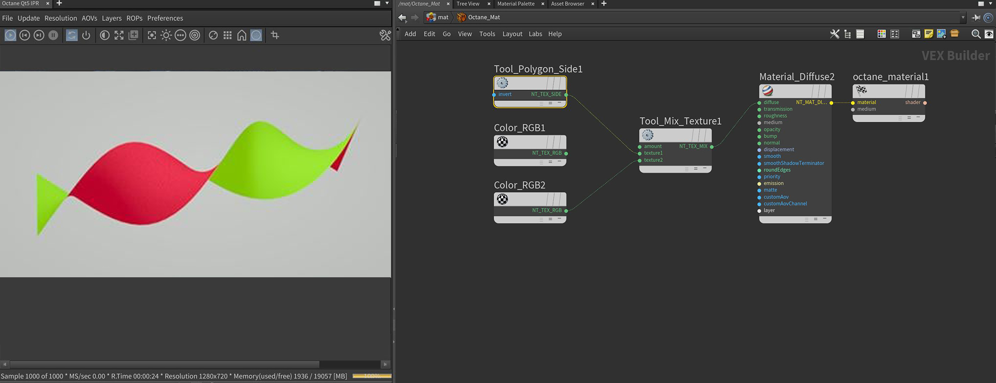 The Polygon Side node assigns black or white values based on the normal direction of a polygon object. This is useful for assigning different textures or materials to different sides of a polygon object. Figure 1 shows a Polygon Side node connected to the Amount parameter of a Mix texture. The Mix texture blends red and green RGB Color nodes. The result connects to an Octane material's Diffuse channel, which is applied to a twisted polygon. This technique is useful for creating a leaf or butterfly wing with different colors, or materials applied to each side.