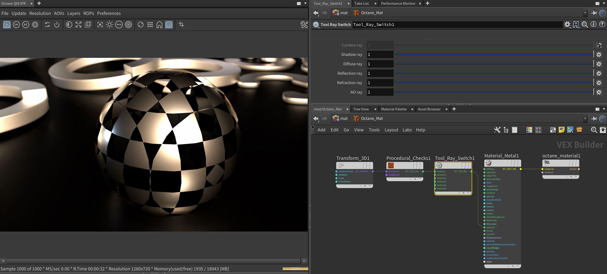 Figure 1: The Ray Switch node with a Checks Texture node connected to the Camera Ray input is wired to the Opacity input on a Diffuse material