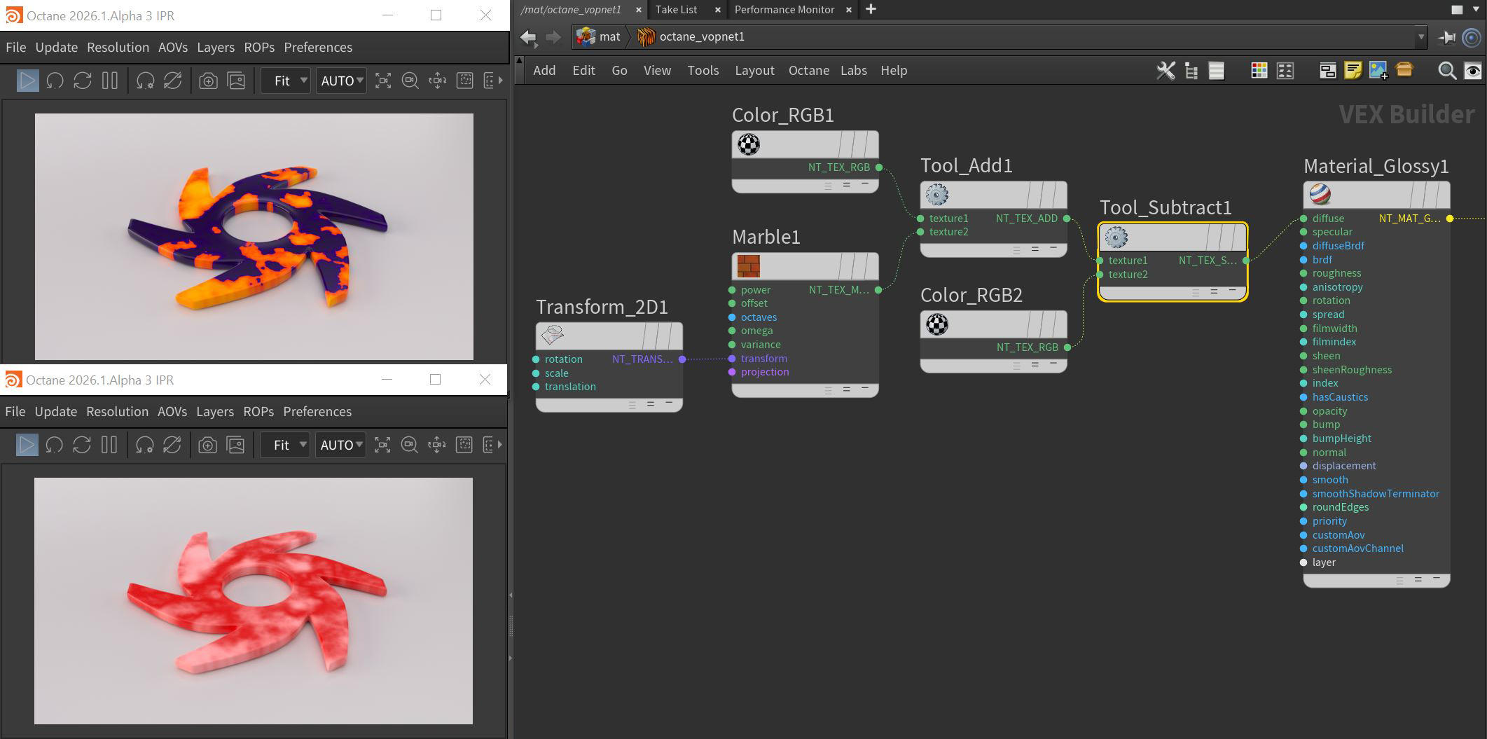 Figure 1: Using the Subtract node to mix a Marble texture with two RGB color nodes