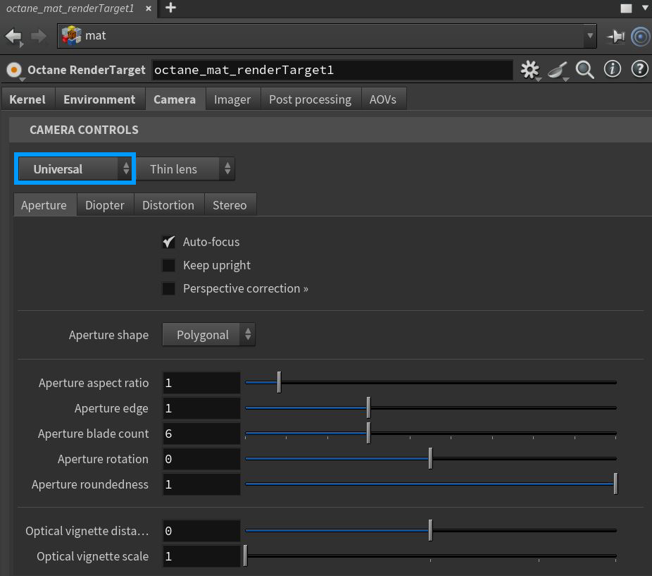 - Thin lens - The default Octane camera type.