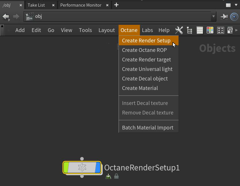 Figure 1: Adding the Octane Render Setup node in the Out network window